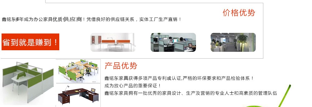 深圳市鑫銘東家具有限公司深圳市鑫銘東家具有限公司專業(yè)銷售各類辦公家具!產(chǎn)品涉及多種系列,如:班臺、班椅、屏風、會議桌、會議椅、辦公沙發(fā)、茶幾、辦公桌、文件柜、電腦桌椅、各式餐臺、餐椅、書柜等辦公家具。 鑫銘東家具擁有一批優(yōu)秀的家具設(shè)計、生產(chǎn)及營銷的專業(yè)人士和高素質(zhì)的管理隊伍。銘東家具以"先難后易"之戰(zhàn)略,在產(chǎn)品結(jié)構(gòu)、產(chǎn)品質(zhì)量及服務(wù)水平方面,均推陳出新,力求完善,精益求精。使我們的產(chǎn)品質(zhì)量保持在國內(nèi)外家具潮流的先進水平,力求滿足客戶的特殊需求。鑫銘東家具多年來致力于環(huán)保、實用家具的設(shè)計與開發(fā),集生產(chǎn)、銷售、服務(wù)于一體。本著"以人為本"的設(shè)計理念,大量開發(fā)符合人體工程學(xué)的各種產(chǎn)品,以"誠信為本"的質(zhì)量方針,真材實料,認認真真做產(chǎn)品,實實在在做人。鑫銘東家具更致力于創(chuàng)造"零維修率"的制造境界,實現(xiàn)"沒有維修的服務(wù)才是最好服務(wù)"的口號》了解更多 |
